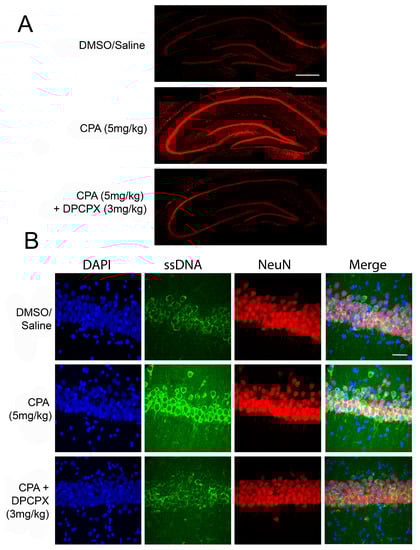 Adenosine A1R activation induces neuronal death in vivo. (A) Representative confocal microscopy images showing hippocampal slices stained with propidium iodide, a fluorescent marker for cell death. Male Sprague-Dawley rats were given intraperitoneal (i.p.) injections of CPA (5 mg/kg) or CPA (5 mg/kg) + DPCPX (3 mg/kg) and sacrificed at 48 h following initial injection. Acute coronal brain slices were taken and stained with propidium iodide. In animals treated with CPA alone, there was significantly increased propidium iodide fluorescence, indicating increased cell death in the hippocampus. DPCPX treatment prevented CPA-induced neuronal death. Scale bar 0.5 mm; (B) Confocal microscopy images of area CA1 of rat hippocampal slices with the same in vivo treatments above. DAPI, a nuclear stain is shown in blue (far left panels), single-stranded DNA (ssDNA) shown in green (second from left panels), NeuN shown in red (second from right panels), and a merge of all three channels shown in the far right panels. The marker ssDNA was used to label apoptotic cells, while NeuN (a neuronal marker) was used to label the CA1 cell layer. CPA treatment caused increased ssDNA staining in CA1 compared to control and DPCPX + CPA treated brains, indicating that CPA treatment was pro-apoptotic. Scale bar 30 µm.