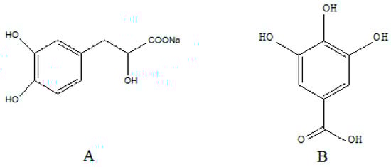 Sodium danshensu (sodium d-(+)-β-(3,4-dihydroxyphenyl) lactate) is a sodium salt of danshensu extracted from Danshen (Figure 1). As a popular traditional Chinese medicine, Danshen is the dried root of the traditional Chinese herb Salvia miltiorrhiza that belongs to the family of Labiatae, and has been used extensively in many traditional Chinese medicine prescriptions for treating various diseases, especially in cases of hepatitis, and cerebrovascular and cardiovascular diseases [1], such as cardiodynia, myocardial infarction [2], intimal hyperplasia, and attenuated restenosis [3]. According to the study of phytochemistry, the main bioactive constituents in the roots of Danshen can be classified into two broad categories: the hydrophilic phenolic acid compounds and the lipophilic tanshinone compounds [4,5]. Among these constituents, danshensu is one of the major constituents of hydrophilic phenolic acid compounds, which has been shown to exert several pharmacologic effects such as a cardioprotective effect [6], prevention of ischemia/reperfusion injury [7,8], anti-oxidative damage [9], hydroxyl radical scavenging roles [10], and so on. Therefore, sodium danshensu as a candidate compound has attracted considerable attention, and it is necessary to study the pharmacodynamics, pharmacokinetics, and safety of sodium danshensu.