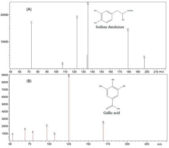 Representative product ion mass spectra of (A) Sodium danshensu (B) Gallic acid (IS).
