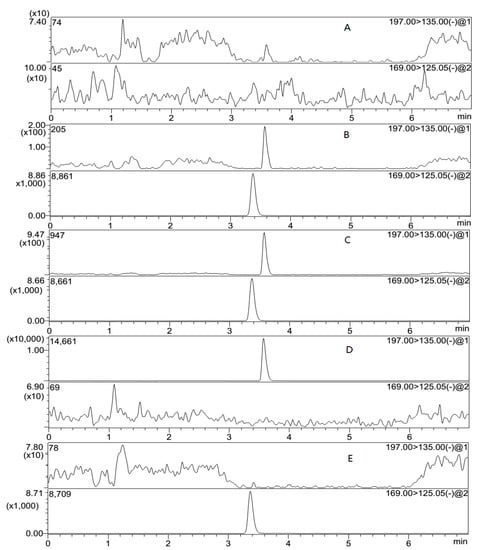 In addition, the “cross-talk” of MRM channels for the analyte and IS was checked. Figure 3D,E clearly shows no MS/MS response from the analyte into the IS channel and vice versa.