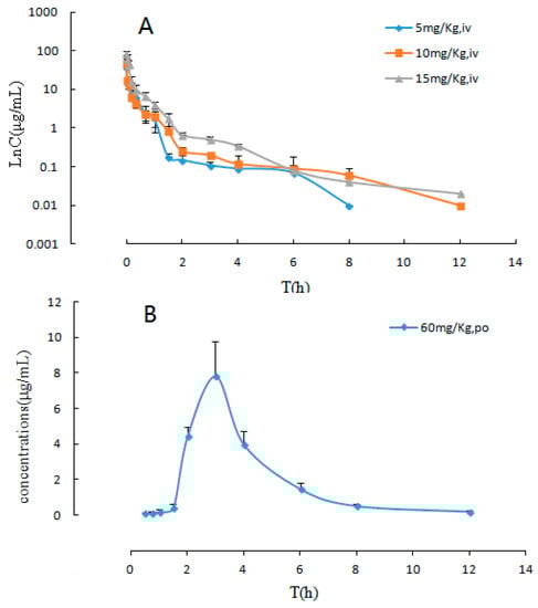 For pharmacokinetics study, 24 beagle dogs were randomly divided into four groups (n = 6). Four different dosages (5 mg/kg, 10 mg/kg, 15 mg/kg I.V., 60 mg/kg P.O.) were designed and were assigned randomly to the four groups of beagle dogs. Blood samples (500 μL) were withdrawn from the foreleg vein into heparinized tubes in strict accordance with the time points of the protocol made in advance. Then after centrifuging at 8000 rpm for 10 min, the supernatant plasma sample was transferred into another tube and frozen at −80 °C until analysis. The time points for blood sampling were listed as follows. Pre-dose and subsequently at 0, 0.03, 0.08, 0.17, 0.33, 0.67, 1, 1.5, 2, 3, 4, 6, 8, and 12 h were used for the three intravenous injection groups, and pre-dose, 0.08, 0.17, 0.25, 0.5, 0.75, 1, 1.5, 2, 3, 4, 6, 8, and 12 h were used for the oral administration group.
