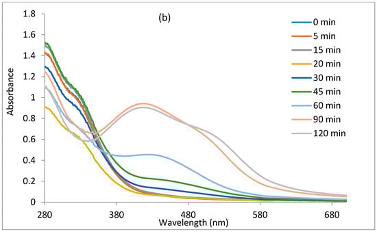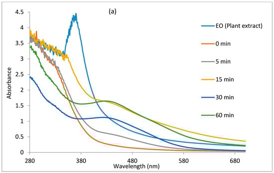 The reduction of Ag+ ions to Ag0 by E. odoratum leaf extract was monitored with the use of a UV-VIS spectrophotometer by recording the absorption as a function of time, as shown in Figure 1a,b. Figure 1a shows the UV-VIS spectra of the nanoparticles synthesized at a 1:5 ratio of plant extract to silver nitrate, while Figure 1b shows the UV-VIS spectra of silver nanoparticles synthesized at a 1:10 ratio of plant extract to silver nitrate. The figures show that an increase in contact time increases the intensity of the localized surface plasmon resonance, reflecting an increase in the concentration of nanoparticles up to a point before the concentration of nanoparticles decreases. In Figure 1a, the nucleation appears to proceed faster compared to Figure 1b, as localised surface plasmon resonance bands were noticed at 30 min of the reaction period, while it became visible after 60 min in Figure 1b. The localised surface plasmon resonance band showed maximum absorbance at 424 nm in Figure 1a. In Figure 1b, the maximum absorbance band of the localised surface plasmon resonance appeared at 424 nm after 60 min and exhibited a blueshift to 418 nm after 120 min, but with a reduction in intensity and appearance of a broad plasmon band and a hump around 515 nm. The reduction in intensity of the band in Figure 1b may be attributed to some digestive ripening among the nanoparticles which will saturate the reaction with polydispersed nanoparticles of smaller sizes and equally larger ones, hence, the observed band around 515 nm [55,56]. The optical absorption spectra of metal nanoparticles is dominated by the SPR, which shifts toward the red or blue end depending upon the particle size, shape, state of aggregation, and the surrounding dielectric medium [57,58].