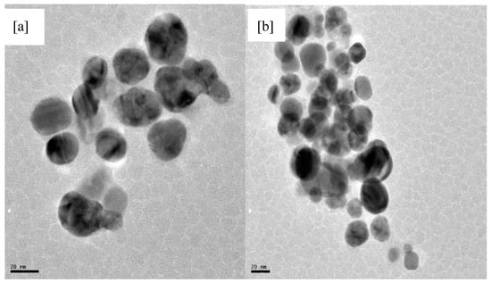 Transmission electron microscopy (TEM) was employed to determine the size, shape, and particle morphology of the synthesized nanoparticles. The representative TEM micrographs are shown in Figure 2a,b. Figure 2a showed that the morphology of the nanoparticles was spherical and with an average particle size of 23.6 nm. The dispersed appearance of the nanoparticles indicates stabilization by some capping agents. The effect could be due to capping by saponins and proteins. In Figure 2b, there seems to be digestive ripening of the larger molecules into smaller particles, which culminated in agglomeration and polydispersity [42]. This was observed when the concentration ratio of the extract to AgNO3 was reduced (i.e., 1:10). The particles size is in the range of 8.2–20.5 nm. The figure depicts particles of varied sizes, which was supported by the nature of the plasmon bands shown in Figure 1b.