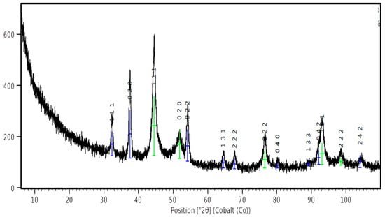 Representative PXRD patterns for the synthesized nanoparticles is presented in Figure 3. The peaks at 2θ of 44.48°, 51.84°, 76.43°, 93.04°, and 98.56° are related to the (111), (020), (022), (131), and (222) planes of Ag, which matches with the reflections of crystallographic planes of the face-centered cubic structure of metallic silver (JCPDS file No. 04-004-6436). The (111) orientation of the silver is more intense than other peaks suggesting (111) as its predominant orientation. The pattern also shows peaks at 2θ of 32.30°, 37.49°, 54.11°, 64,48°, 67.73°, 80.13°, 89.09°, 92.07°, and 104.10°, which are attributed to (111), (020), (022), (131), (222), (040), (133), (042), and (242) planes of Ag2O nanocrystals (JCPDS No. 04-006-5378). Co-existence of silver and silver oxide nanoparticles synthesized by extracts of plants has been reported [59]. Plant extracts contain various organic compounds (e.g., flavonoids) that possess various oxygen-containing functional groups that may coordinate with silver ions to form coordination bonds due to their ability to donate electrons [59] as shown in Scheme 1. This process may be responsible for the oxidation of silver to silver oxide. In addition, the peak broadening of Ag and Ag2O suggests that the typical size of the particles is small, and this is consistent with our TEM observation.
