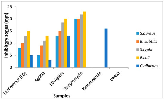 Antimicrobial evaluation of the nanoparticles was compared to the antimicrobial results of EO plant extract, AgNO3, and standard drugs. The results are presented as a histogram in Figure 4. The antimicrobial activities of the samples were found to be, in decreasing order, NPs ˃ AgNO3 ˃ EO plant extract. The plant extracts (EO) gave antimicrobial activities with inhibition zones in the range 8–15 mm while the AgNO3 gave inhibition zones in the range 5–13 mm. The nanoparticles exhibited good antimicrobial activities with inhibition zones in the range of 13–20 mm. The NPs showed the best antimicrobial activities among the screened samples. They were more active against the bacterial strains than the fungal organism. In the case of E. coli and S. typhi, the nanoparticles gave 87% and 85% antibacterial activities, respectively, compared to that of the standard drug, streptomycin. Similarly, the bactericidal activities of the nanoparticles were higher for Gram-negative bacteria compared to Gram-positive bacteria. The observed increased antibacterial properties of the nanoparticles against Gram-negative bacteria strains compared to Gram-positive bacteria strains could be attributed to the difference in lipophilicity of the nanoparticles through the different bacteria cell compositions. Gram-positive bacteria contain a rigid cell wall network with a peptidoglycan layer making it resistant to mechanical rupture, while Gram-negative bacteria have a cell membrane network that is only one molecule thick, together with up to 25% (mass) of lipoprotein and lipopolysaccharide. The miniature size of nanoparticles has been implicated as supporting permeability through bacteria cells. However, the more fortified cell wall of the Gram-positive bacteria makes it less penetrable compared to the cell membrane of the Gram-negative bacteria [63,64]. The nanoparticles also gave the best antifungal activity compared to the plant extract and AgNO3. The results of the antimicrobial screening of the silver nanoparticles are in agreement with other reported works on green-mediated silver nanoparticles [60,65]. The antimicrobial effect of each dose of the samples was calculated statistically. The regression line and estimated value with standard error were also considered. All of the experiments were performed thrice. However, this experimental data was further investigated by applying the ANOVA test (p < 0.05). Results show that about 99.8% of the variances were accounted for because the value of the adjusted R2 is 0.998.