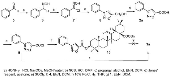 Compound 3a was prepared as shown in Scheme 2. Acid 2a was first synthesized according to [20]. Starting from benzaldehyde (5), consequential transformations including a [3 + 2] cycloaddition of chlorobenzaldoxime (7) and propargyl alcohol to afford phenyl substituted isoxazole acid 2a, which was further converted to acyl chloride 9 that reacted with 4 to furnish the 3-O-acylated analogue 10. However, the debenzylation of 10 to afford the desired product 3a proved troublesome, maybe due to the ring-opening of the isoxazole group under hydrogenolysis conditions as reported [21]. Thus, 3a was finally prepared in reasonable yield (63.0%) by direct acylation of 1 with 9.