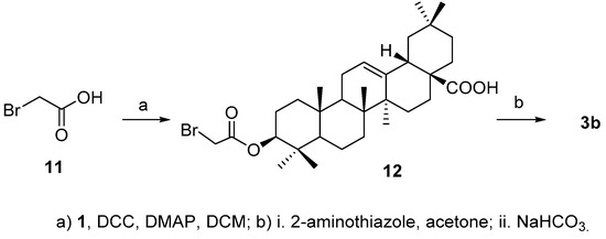 For the synthesis of 3b, acid 2b was initially prepared successfully by reacting 2-aminothiazole with bromoacetic acid (11) [22], but the aminothiazole acetic acid failed to attach to 3-OH in 4 either by coupling reaction in the presence of N,N′-dicyclohexylcarbodiimide (DCC) or N-(3-dimethylaminopropyl)-N′-ethylcarbodiimide (EDCI) in the presence of 4-dimethylaminopyridine (DMAP) or using the corresponding acyl chloride. Alternatively, bromoacetic acid 11 was coupled with 1 to afford 12 [23], which was then treated with 2-aminothiazole to afford the desired product 3b (Scheme 3) in 50.6% yield over two steps.