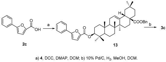 To a stirred solution of 4 (40 mg, 0.07 mmol) in DCM (1 mL) was added 2c (55 mg, 0.29 mmol), EDCI (70 mg, 0.37 mmol) and DMAP (5 mg, 0.04 mmol). The mixture was stirred at 50 °C for 4 h. Then the reaction solution was concentrated. The residue was purified through a silica chromatography column (petroleum ether−EtOAc 20:1) to afford the product (13) as white solid (41 mg, 78.0%). 1H-NMR (300 MHz, CDCl3): δ 7.78 (2H, d, J = 7.5 Hz, H-2, 6 of Ph) 7.42 (3H, m, H-3, 4, 5 of Ph), 7.34 (5H, s, Bn), 7.10 (1H, d, J = 1.8 Hz, H of furan), 6.73 (1H, d, J = 1.8 Hz, H of furan), 5.30 (1H, br s, H-12), 5.08 (2H, ABq, J = 12.0 Hz, CH2 of Bn), 4.72 (1H, t, J = 8.7 Hz, H-3α), 2.91 (1H, d, J = 12.9 Hz, H-18), 1.14 (3H, s, CH3), 0.99 (3H, s, CH3), 0.95 (6H, br s, 2CH3), 0.92 (3H, s, CH3), 0.90 (3H, s, CH3), 0.63 (3H, s, CH3). ESI-MS: m/z [M + Na]+ 739.6.