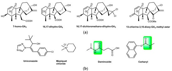 Gibberellic acid (GA3) derivatives (a) and commercially available synthetic plant growth regulators (PGRs) (b).