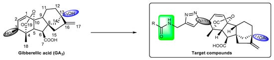Many PGRs regulate the growth of plants and contain an amide group, such as daminozide and carbaryl. Taking into consideration the chemical group, we believed that modified GA3 derivatives characterized by amide groups could provide interesting bioactivities to the target compounds. As part of our research in the field of PGRs [10,11,12,13], we report herein the synthesis of a series of novel C3-OH substituted GA3 derivatives bearing an amide moiety. To reach this aim, we applied a Huisgen ‘click’ cycloaddition [14] because it proceeds via the formation of a highly proteolytic and metabolic stable intermediate presenting a triazole moiety [15]. Besides, Mander and co-workers reported that the addition of an acetate group at the C13 position of 16,17-dihydro-GA5 increased the inhibition efficacy of the molecule towards graminaceous species [16]. Following this interesting result, we also acetylated the hydroxyl group at the C13 position of our target compounds. Fifteen new gibberellin derivatives were synthesized, and their inhibitory activities towards rice (Oryza sativa L.) and Arabidopsis were evaluated.