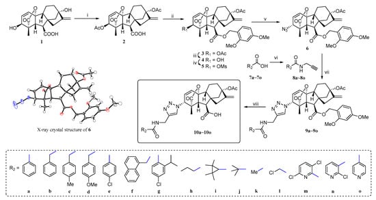 Secondly, fifteen different carboxylic acids containing phenylic, aliphatic, and pyridyl groups (7a–7o) were selected as the initial materials to perform acyl chlorination [21] with oxalyl chloride and DMF in dichloromethane (Scheme 1). The acyl chloride substrates were subjected to amidation with mono-propargylamine and triethylamine in dichloromethane to afford the alkynyl carboxamides (8a–8o). Then, the expected target compounds presenting the protection groups (9a–9o) were formed by the fusion of a specific azide intermediate 6 with the terminal alkyne group of the corresponding alkynyl carboxamide (8a–8o) via a Huisgen ‘click’ cycloaddition [14,22]. Finally, the protecting groups were selectively removed following typical procedures from literature [23,24]. Shortly, the 2,4-dimethoxybenzyl esters could be readily oxidized by 2,3-dichloro-5,6-dicyano benzoquinone (DDQ) to generate the corresponding carboxylic acids. Unexpectedly, we did not obtain the target compounds (10a–10o) according to this method. Indeed, this specific carboxylic acid is prone to a different acidic character when compared to a simple carboxylic acid. Moreover, the funtional groups in the ring A of GA3 were quite sensitive under many reaction conditions [4,7,25]. In order to overcome the difficulty described above, a series of thorough experiments were carried out. Fortunately, we found that zinc dichloride used as a catalyst could cleave the 2,4-dimethoxylbenzyl esters (9a–9o) to successfully obtain the corresponding carboxylic acids (10a–10o) without affecting other sensitive functional groups such as lactone, acetyl, amide, or triazole group. This method offered a practical protective strategy for complex structures. The molecular structure of the intermediates and target compounds was confirmed by 1H- and 13C-NMR spectroscopy and High-resolution mass spectra (HRMS).