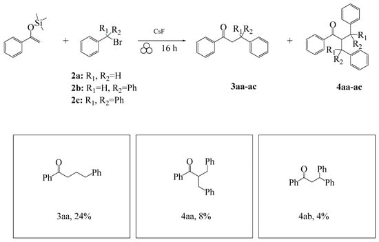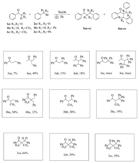 From the given results, it is clear that various competitive reactions are highly influential in the formation of the enolate addition product. When comparing ketone reagents on solid support, Muzart demonstrated the aldol condensation reactivity is highest for acetophenone as compared to more sterically hindered ketones []. In addition to the aldol condensation, the base can also act as a nucleophile which leads to additional side products in many of these reactions. We believe strategic control over the steric bulk of the ketone and alkyl halide is key to controlling the yield of mono addition products. In the case of isobutyrophenone (1c), which forms a tertiary enolate (entries 3ca–3cc), the presence of the two methyl groups prevents the elimination step needed to form the α,β-unsaturated ketone such that it leads to the highest yield of mono addition product [].