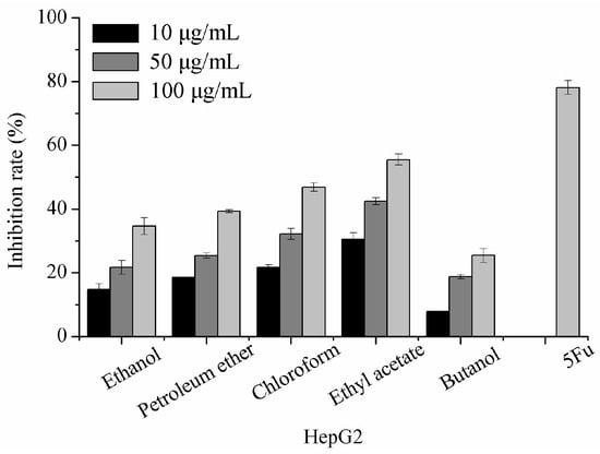The inhibitory effect of extracts on HepG2 cells proliferation was tested. HepG2 cells were incubated with 10, 50, and 100 μg/mL extracts for 72 h. As shown in Figure 1, the HepG2 cell-growth inhibition of all extracts was in a dose-dependent manner. Butanol extract showed the lowest inhibitory effect, whereas ethyl acetate extract showed the strongest inhibitory effect. Ethyl acetate extract demonstrated an inhibition rate of 55.50% on HepG2 at a concentration of 100 μg/mL, indicating that the compounds composed in ethyl acetate extract exerted potent proliferation that inhibited HepG2 tumor cells.