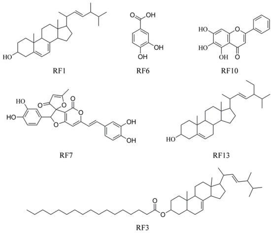 Chemical structures of compounds RF1, RF3, RF6, RF7, RF10, and RF13 isolated from P. baumii mycelium produced by solid-state fermentation in rice.