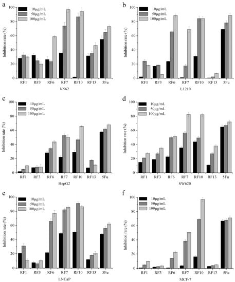K562 is the first human immortalized myelogenous leukemia line. As shown in Figure 4a, RF10 inhibited K562 proliferation in a concentration-dependent manner, and inhibition effects at 50 and 100 μg/mL RF10 were significantly higher than that of positive control 5-fluorouracil (5-Fu). L1210 is another leukemia cell line, derived from the ascitic fluid of 8-month-old female mice. The results showed that the inhibition rates of 50 and 100 μg/mL RF10 were about 84.33% and 84.32%. Similar to the results of leukemia cell lines, the inhibition rates of 100 μg/mL RF10 on HepG2 and SW620 reached about 65.74% and 82.19%, respectively. These values were higher than those of other compounds, and almost equivalent to that of the positive control (5-Fu). LNCaP cells are androgen-sensitive human prostate adenocarcinoma cells, and MCF-7 cells are estrogen-responsive, and often used in vitro to study estrogen receptor-positive breast cancers. As shown in Figure 4e, the inhibitory rates of RF10 at concentration of 50 and 100 μg/mL on LNCaP cells were 91.19% and 86.41%, respectively. These values were significantly higher than that of the positive control group. RF10 showed inhibitory effect on MCF-7 in a concentration-dependent manner, and inhibitory rates of RF10 at concentration of 50 and 100 μg/mL were 69.10% and 97.06%, respectively. RF6 and RF7 were the other two compounds with potent cytotoxicity. As shown in Figure 4e, RF7 had stronger cytotoxicity against K562, SW620, and LNCaP. Furthermore, the inhibition rate of RF7 at a concentration of 100 μg/mL was more than 80%. As shown in Figure 4f, the inhibition rates of RF6 at concentrations of 50 and 100 μg/mL were more than 60% in L1210 and LNCaP. All the results indicated that RF10 had stronger inhibitory activity on tumor-cell proliferation compared with other compounds in this study. The IC50 concentrations of RF10 in various tumor cell lines were determined, as shown in Table 1.