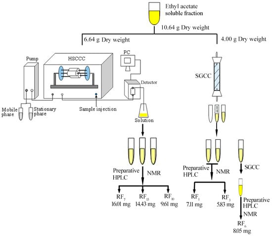 The ethyl acetate soluble fraction was isolated and purified by SGCC (100–200 orders, Qingdao Marine Chemical Inc., Qingdao, China), HSCCC (TBE-300B, Tauto Biotech-nique Company, Shanghai, China), and preparative HPLC to provide compounds. The isolation flow schematic is shown in Figure 5.