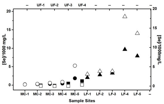 Total Se concentrations in the creek water (solid symbol) spring and (open symbol) fall 2007 in µg/L. UF stands for Upper Fountain Creek (squares), MC Monument Creek (circles) and LW, Lower Fountain Creek (triangles) [21]. Data points were measured in triplicates and details of the sampling site was described.