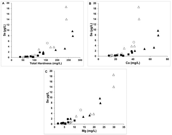 Total Se level ([Se]/µg/L) vs Total Hardness (A), Total Ca level (B) and Total Mg level (C) in the creek water (solid symbol) spring and (open symbol) fall 2007 in µg/L. UF is the Upper Fountain Creek (squares), MC Monument Creek (circles) and LF Lower Fountain Creek (triangles) [21]. Data points were measured in triplicates and details of the sampling sites were described.