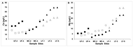 (A) Total calcium concentrations (presumed Ca2+) in the creek water (solid symbols) spring and (open symbols) fall year in mg/L and (B) total magnesium concentration (presumed Mg2+) in the creek water (solid symbols) spring and (open symbols) fall year in µg/L. UF is the Upper Fountain Creek (symbol squares), MC Monument Creek (symbol circles) and LF Lower Fountain Creek (symbol triangles). Data points were measured in triplicates and details of the sampling sites were described [21].