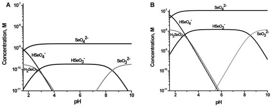 Speciation diagrams were calculated for two different sites along the Fountain Creek in the stream water: (A) The low concentration UF-2 sites with [Se]tot 3.36 × 10−10 M, and (B) LF-4 with [Se]tot 1.22 × 10−7 M. Recently the speciation was determined to around 90% Se(VI) for several of the sites studied in this work [25].