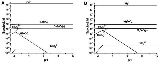 Speciation diagrams were calculated for LF-4 site along the Fountain Creek in the stream water with concentrations (A) of [Se(IV)] 1.2 × 10−8 M, [Se(VI)] 1.1 × 10−7 M and [Ca]tot 1.7 × 10−3 M and (B) [Se(IV)] 1.2 × 10−8 M, [Se(VI)] 1.1 × 10−7 M and [Mg]tot 9.4 × 10−4 M.