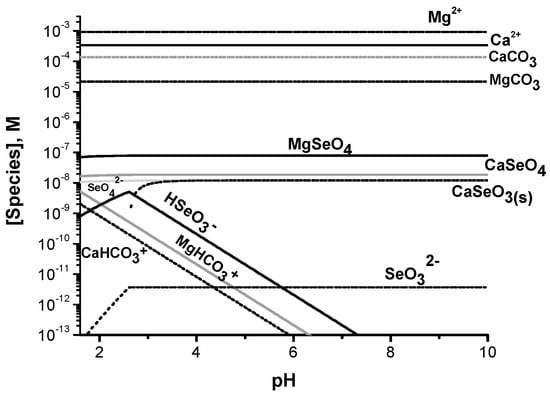 Speciation diagram was calculated for the LF-4 site along the Fountain Creek in the stream water with concentrations of [Se(IV)] 1.2 × 10−8 M, [Se(VI)] 1.1 × 10−7 M, [Ca]tot 1.7 × 10−3 M and [Mg]tot 9.4 × 10−4 M.