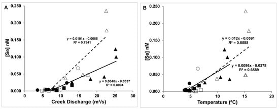 Total Se concentration in nM vs. Creek discharge in m3/s (A) and Se concentration in nM vs. water temperature (°C) (B). Selenium concentrations in the creek water (solid symbol) spring and (open symbol) fall 2007 in nM. UF stands for Upper Fountain Creek (squares), MC Monument Creek (circles) and LW, Lower Fountain Creek (triangles) Regression lines are shown as solid for spring and dashed for fall. Details of the sampling sites were described previously [21].