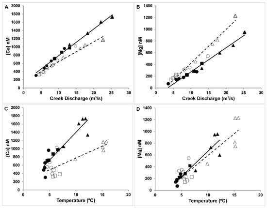 The best relationship to dissolved Se in the creek exists with flow rate (Figure 7A, R2spring = 0.8094, R2Fall = 0.7941). Temperature is also correlated with dissolved Se but the correlation is not as strong as the flow rate (Figure 7B). Together the data for temperature and flow rate suggest that there are symbiotic effects on dissolved Se and that these parameters assist in increasing the amount of dissolved Se, and because these parameters affect the Ca2+ (Figure 8A,C) and Mg2+ (Figure 8B,D) in a similar manner, they contribute to increasing the Ca2+ level above that expected for the solubility product (Figure 8).