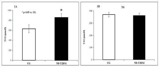 Total oxidant status (TOS) (A) total antioxidant status (TAS) (B) in patients with ND-T2DM versus control group (CG).