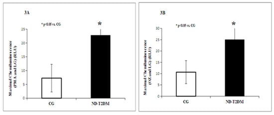 Respiratory burst (PMA and LG) (A) and (OZ and LG) (B) in patients with ND-T2DM versus control group (CG).