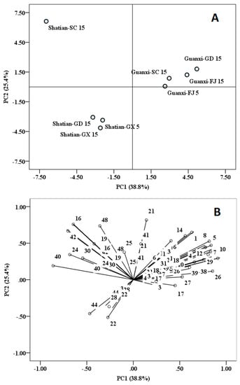 (A) Score plot and (B) loading plot of principal component analysis of the volatile profile in two pummelo cultivars cultivated from different regions of China. The number of volatile compounds corresponds with Supplementary Table S2.