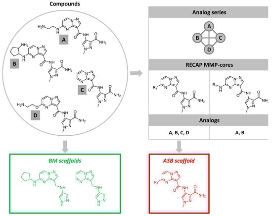 The generation of BM and ASB scaffolds is illustrated. On the left, the structures of four exemplary compounds (A–D) forming an analog series are shown. On the right, a network representing the MMP relationships within the series is displayed. In addition, two RECAP-MMP cores originating from the series are depicted. The core that is shared by all four analogs represents the ASB scaffold (red). Furthermore, BM scaffolds extracted from analogs (A–D) are shown (green).