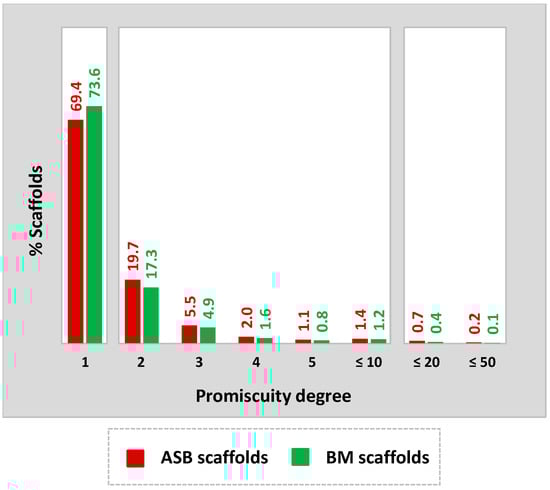 The distribution of 2836 kinase inhibitor ASB (red) and 4492 corresponding BM scaffolds (green) over increasing promiscuity degrees is reported.