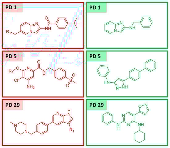 In our current study, we focus on inhibitors of protein kinases, which play a prominent role among current pharmaceutical targets [8]. Over the past two decades, substantial efforts have been made to develop kinase inhibitors for therapy [8,9] and the search for novel inhibitors with new modes of action continues [9]. The human kinome comprises 518 kinases [10] and inhibitors for more than half of them have been reported [11]. In a systematic survey of publicly available inhibitors of the human kinome published two years ago, nearly 19,000 small molecule kinase inhibitors with available high-confidence activity data were identified that were directed against 266 human kinases [11]. These kinase inhibitors contained more than 7800 unique BM scaffolds [11,12]. Thus, there was a high degree of scaffold diversity among kinase inhibitors, but the majority of these scaffolds were involved in structural relationships [12]. Most kinase inhibitors were classical type I ATP site-directed compounds [13] while inhibitors with other modes of actions were rare [11].