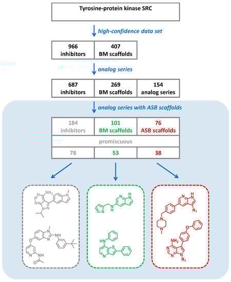 As a representative example for a popular kinase target, inhibitors and scaffolds are reported for tyrosine kinase Src. The distribution of inhibitors and scaffolds with high-confidence activity data, analog series, and analog series yielding ASB scaffolds is shown in Figure 4. In total, there were 184 Src inhibitors producing 101 BM and 76 ASB scaffolds. In addition, there were 78 promiscuous kinase inhibitors yielding 53 and 38 promiscuous BM and ASB scaffolds, respectively.