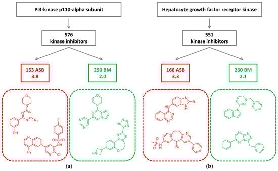 For two kinases, (a) PI3-kinase p110-alpha subunit and (b) hepatocyte growth factor receptor kinase, the number of inhibitors yielding ASB scaffolds, the number of ASB scaffolds, and the number of BM scaffolds contained in these inhibitors are reported. In addition, compound-to-scaffold ratios are given for ASB and BM scaffolds. Exemplary ASB (red) and BMscaffolds (green) are shown.