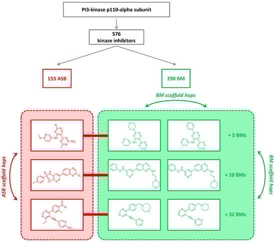 For inhibitors of the PI3-kinase p110-alpha subunit according to Figure 5a, three exemplary ASB scaffolds are shown (red). For each of the corresponding analog series, two exemplary BM scaffolds are provided (green). In each case, the number of additional BM scaffolds originating from the series is reported. Arrows indicate possible scaffold hops.