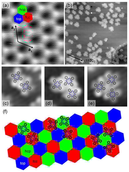 By analyzing the orientation of molecular trimers that adopt an isosceles triangular shape (Figure 1d) the preferred stacking region for adsorption may be identified. While the long side of the isosceles triangles is aligned with , the short sides enclose an angle of with it. Moreover, the orientation of these trimers is uniform, that is, isosceles triangles rotated in the surface plane by integer multiples of with respect to the orientation of trimers visible in Figure 1 were not observed. These results are only compatible with the two molecules that form the long side of the trimer residing at fcc regions while the remaining one occupies the adjacent hcp region (Figure 1f).