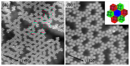 (a) STM image of graphene-covered Ir(111) after deposition of of 2H-Pc (, , ). Inset: Close-up view of (a) with , indicating the unit cell vectors of the densely packed superstructure; (b) STM image of a large molecular island exhibiting the close-packed 2H-Pc arrangement (, , ).