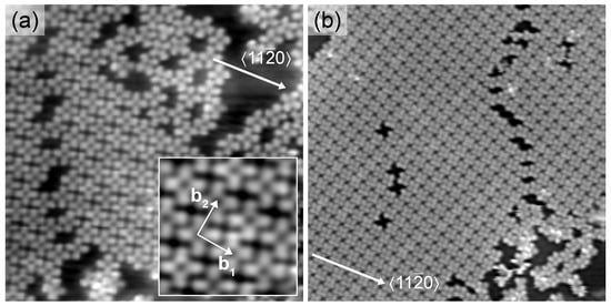 - Hattab, H.; N’Diaye, A.T.; Wall, D.; Jnawali, G.; Coraux, J.; Busse, C.; van Gastel, R.; Poelsema, B.; Michely, T.; zu Heringdorf, F.J.M.; von Hoegen, M.H. Growth temperature dependent graphene alignment on Ir(111). Appl. Phys. Lett. 2011, 98, 141903. [Google Scholar] [CrossRef]