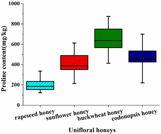 Box plot diagram of proline content in rapeseed, buckwheat, sunflower, and Codonopsis honey samples. The horizontal lines in the box denote the 25th, 50th, and 75th percentile values. The error bars denote the 5th and 95th percentile values. The height of the box is the measure for the tolerance.
