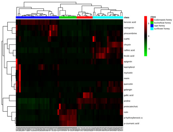 Hierarchical clustering was used to show the phenolic and proline differences of different floral origin honeys. The dendrograms of the hierarchical clustering and heatmap results are shown in Figure 3. Honeys samples were obviously clustered into two main groups. One group contained mainly rapeseed honeys and the other group included buckwheat, sunflower, and Codonopsis honeys, indicting similarities between these three types of honeys, which was consistent with the PCA results. All samples of the four honey types were arranged in homogenous clusters, indicating that different floral origin honeys may be distinguished based on their phenolic profiles and proline content.
