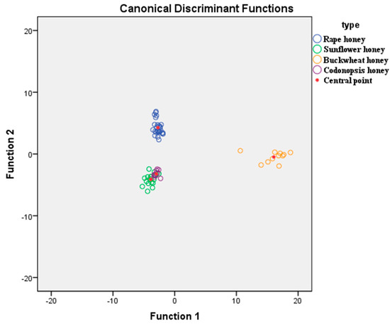 LDA was used for the categorization of the honey samples. The grouping variables were the sixty-seven honey samples of different types (rapeseed, sunflower, buckwheat and Codonopsis) and the independent variables were the 18 phenolic compounds and proline. Results showed that three statistically significant discriminant functions were formed (Wilk’s Lamda = 0, X2 = 462.611, df = 57, p value = 0 < 0.05) for the first function, (Wilk’s Lamda = 0.011, X2 = 244.139, df = 36, p value = 0 < 0.05) for the second and (Wilk’s Lamda = 0.176, X2 = 94.630, df = 17, p value = 0 < 0.05) for the third. The first discriminant function accounted for 73.8% of total variance while the second accounted for19.8%. Both accounted for 93.6% of the total variance. Figure 4 shows the scatter plot of honey samples defined by the discriminant functions. It was shown that the rapeseed and buckwheat honeys were well differentiated from sunflower and Codonopsis honeys. More specifically, the first discriminant function clearly separated buckwheat honey from all other honey types while the second discriminant function clearly separated rapeseed honey from all other honey types. The overall correct classification rate was 98.5% and 94.0% separately, using both the original and the cross validation method. Correct classification (100.0%) was obtained for Codonopsis honey samples followed by those of sunflower, rapeseed, and buckwheat (correct classification 94.7%, 92.6% and 90.9%, separately).