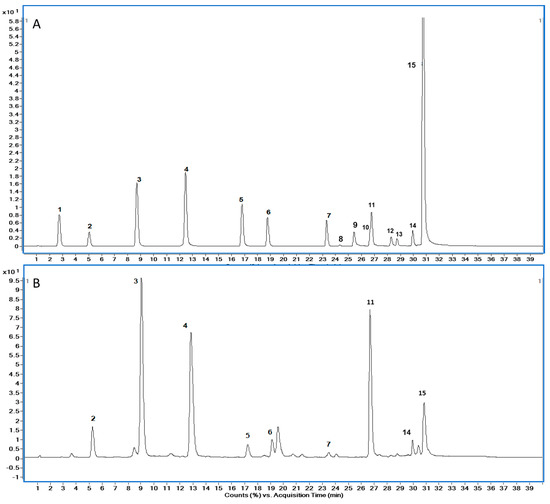 (A) TIC chromatogram of phenolic standard. (B) TIC chromatogram of buckwheat honey. Compound names and retention times (min) are as follows: (A): peak 1, gallic acid (2.74), peak 2, protocatechuic acid (5.05), peak 3, p-hydroxybenzoic acid (8.73), peak 4, caffeic acid (12.52), peak 5, p-coumaric acid (16.88), peak 6, ferulic acid (18.88), peak 6, benzoic acid (18.92), peak 7,rutin (23.42), peak 8, myricetin (24.41), peak 9, morin (25.47), peak 10, quercetin (26.70), peak 11, naringenin (26.82), peak 12, kaempferol (28.29), peak 13, apigenin (28.75), peak 14, pinocembrin (29.95), peak 15, CAPE (30.77), chrysin (30.95), galangin (31.11). (B): peak 2, protocatechuic acid (5.05), peak 3, p-hydroxybenzoic acid (8.73), peak 4, caffeic acid (12.52), peak 5, p-coumaric acid (16.88), peak 6, ferulic acid (18.88), peak 7, rutin (23.42), peak 11, naringenin (26.82), peak 14, pinocembrin (29.95), peak 15, CAPE (30.77), chrysin (30.95), galangin (31.11).