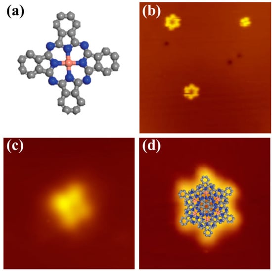 As an archetype molecule with organic semiconducting properties in the bulk, transition-metal phthalocyanines (TMPc) have attracted considerable interest due to their potential applications in organic electronic devices in the past few years [1,2,3]. Because of their high thermal stability, electronic structure, and symmetric cross-like geometrical structure in Figure 1a, TMPc can be used in organic solar cells [4], organic light emitting diodes [5], and organic field-effect transistors [6]. The interactions between TMPc and different solid surfaces have been intensively investigated by many techniques. Scanning tunneling microscopy (STM) has been proven a powerful technique for studying the geometric conformations of TMPc molecules on solid surfaces owning to the capability of high spatial resolution [7,8,9,10]. In particular, the chirality of self-assembled structures of the achiral TMPc molecules deposited on solid surfaces has been a hot topic in recent years [11,12,13,14,15,16]. Highly symmetric molecules adsorbed on a substrate with dissimilar point-group symmetry have also been shown to develop chirality through asymmetric intermolecular interactions [14,15].