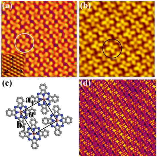 (a) Chiral feature appeared in the filled state STM image of the two-dimensional domains, 15 × 15 nm, −1.4 V, 28 pA; (b) Chiral feature disappeared essentially in the empty state STM image of the 2D domains, 10 × 10 nm, +0.5 V, 28 pA; (c) The structural model of the flat-lying 2D domain; (d) Morié fringe observed in the 2D domain of CuPc, 30 × 30 nm, −2.0 V, 28 pA.