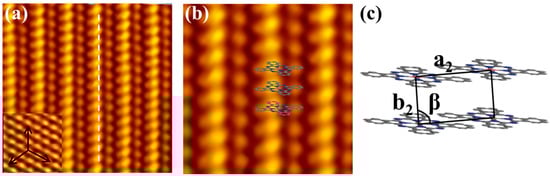 (a) High resolution STM image of the second layer of CuPc films consist of parallel standing-up CuPc chains, 7nm × 7 nm, −0.8 V, 28 pA; (b) Zoomed-in STM image of the second layer domain, in which the CuPc molecules are marked by the superposed structural models; (c) The structural models of the unit cell in domain (a).