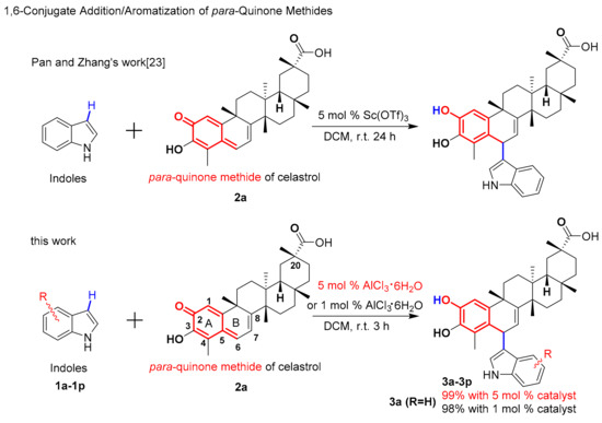 A classical Friedel-Crafts alkylation of different indoles catalyzed by AlCl3·6H2O has been developed for a well-known important natural product, celastrol, resulting in a series of derivatives for further biological evaluation. The catalyst loading was reduced to 5 mol %, the reaction proceeds at ambient temperature and reaction time is only 3 h. The product yields range from 20% to 99%. A reaction mechanism is also proposed, based on our experiment results.
