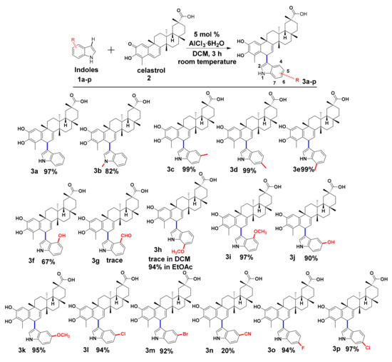 Celastrol (2a, 0.222 mmol, 100 mg) and indole (3a, 0.266 mmol, 31 mg) were dissolved in dichloromethane (DCM, 2 mL) in a 10 mL closed tube. After intensive stirring at room temperature, the metal catalyst AlCl3·6H2O (5 mol %, 2.7 mg) was added to the solution and the reaction mixture was stirred for 3 h. When the reaction was finished, pure water (20 mL) was added to stop the reaction and subsequently the aqueous phase was separated and extracted with ethyl acetate (20 mL) three times. The organic layers were combined and dried with anhydrous sodium sulfate. The solvent was removed in vacuo, giving a crude mixture which was purified by flash chromatography on silica column (hexane/ethyl acetate/AcOH = 4:1:0.005) to give the pure products 3a–3q, 1a2b, 1a2c. NMR spectra for all compounds can be found in Supplementary Materials.