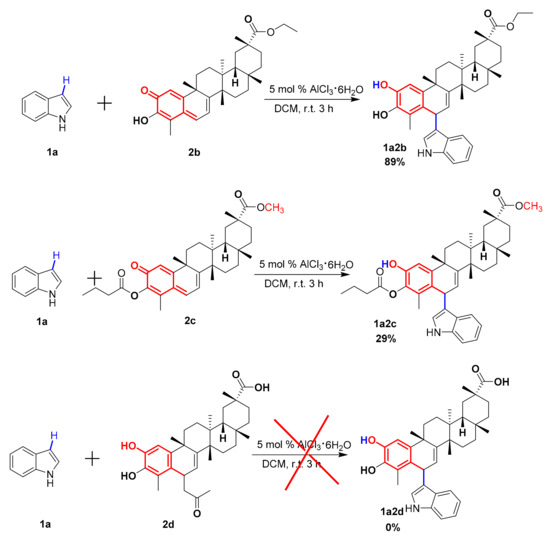 Furthermore, in order to evaluate the influences of the carboxyl and hydroxyl groups of celastrol in this reaction, we synthesized compounds 2a–2c (Scheme 3). The results showed that ethylation of the carboxylic acid of celastrol reduced the catalytic efficiency of aluminum chloride hexahydrate, leading to a yield of only 89% (Scheme 3, 1a2b). Furthermore, if the hydroxyl group was blocked, the reaction yield further dropped to 29% (Scheme 3, 1a2c). Additionally, Friedel-Crafts addition did not occur when the C6 position of celastrol was blocked by a sterically hindered group such as a propan-2-one group (Scheme 3, 1a2d).
